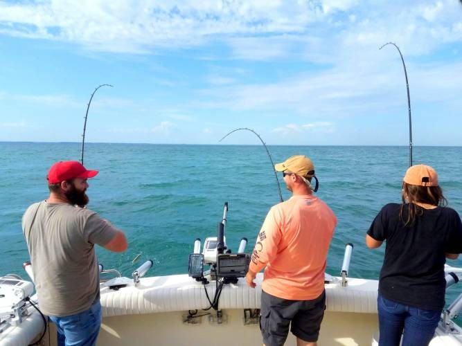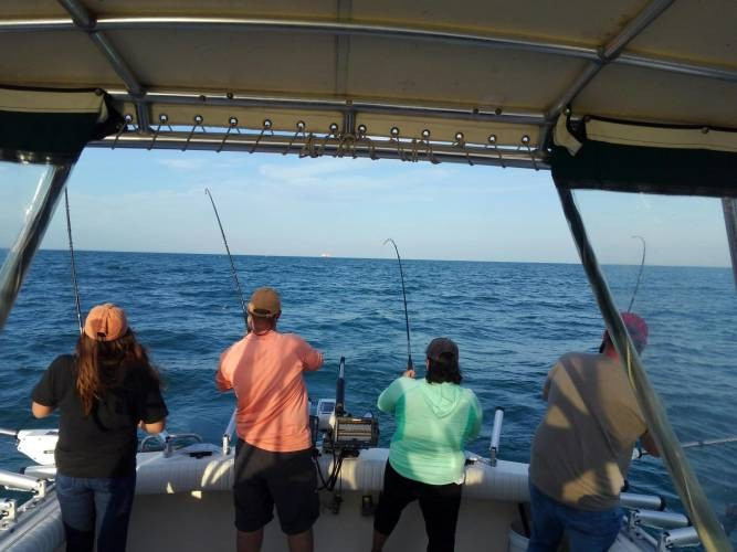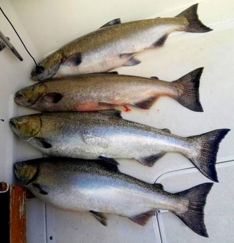 We had a few singles, a double, a tripple and 2 QUADS! We were boxed out by 10am. We grinded for bites the last two days fishing ice water and today the warm water came back. My Fish Hawk Electronics blue tooth unit kept me in the right water collum so I could get all the rods to fire! Man I love the Niagara bar! All fish were caught on flasher fly combinations. Team Dreamweaver white dbl crush spin doctors with A-Tom-Mik Mfg. flys. Mirage,green pearl,glow pro-am and hypnotist have all been chipping in to fill coolers.
